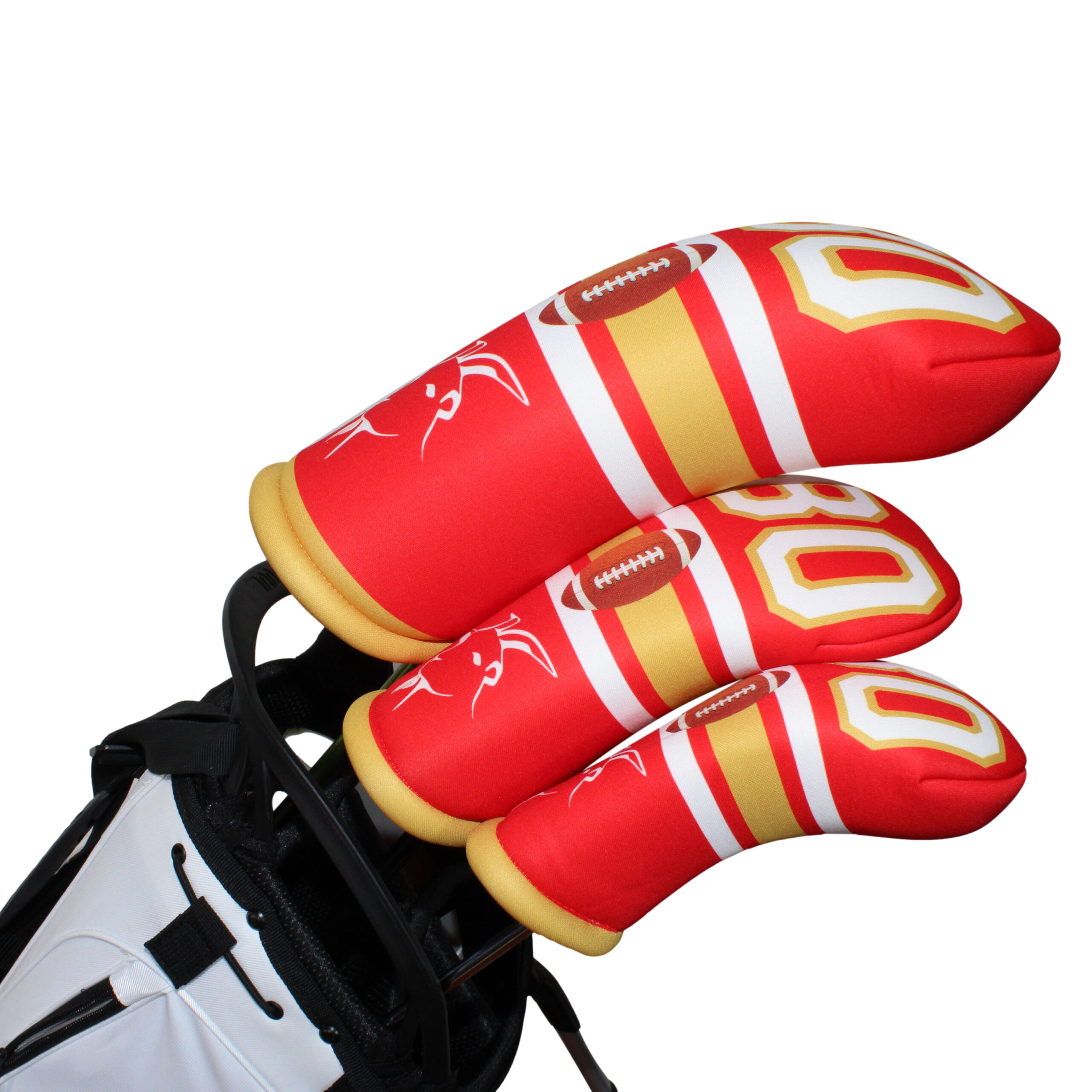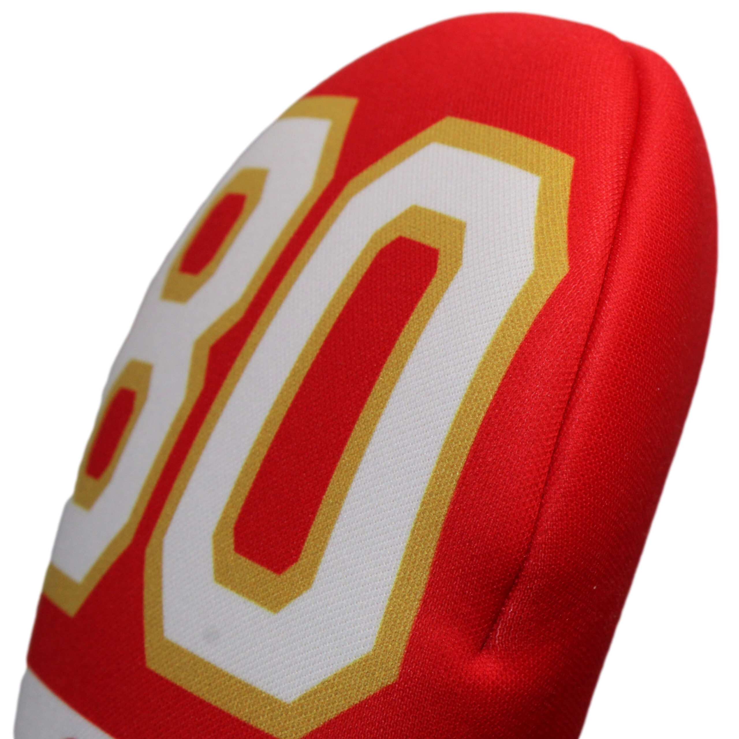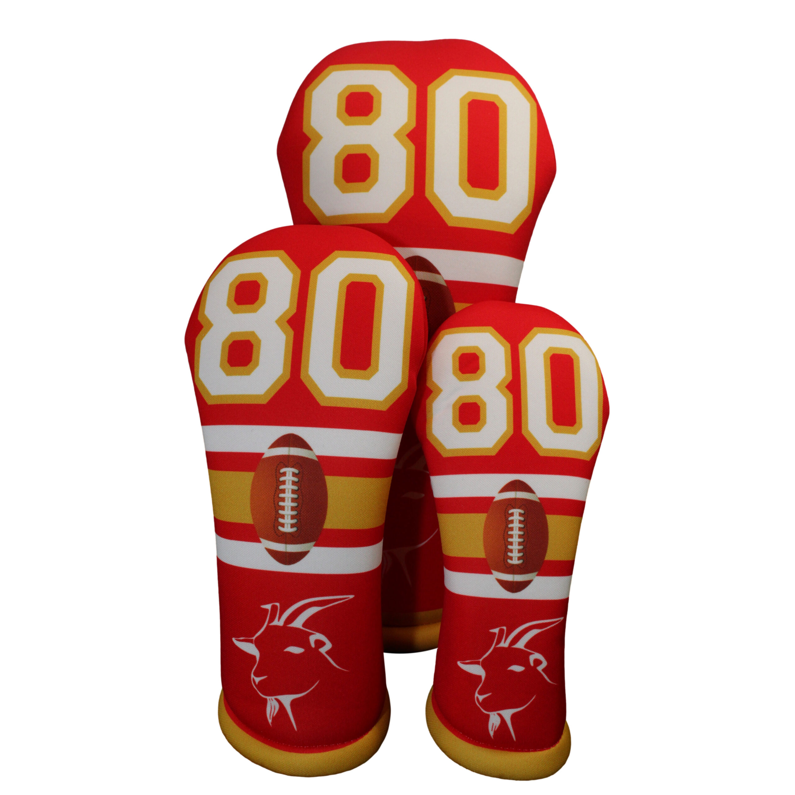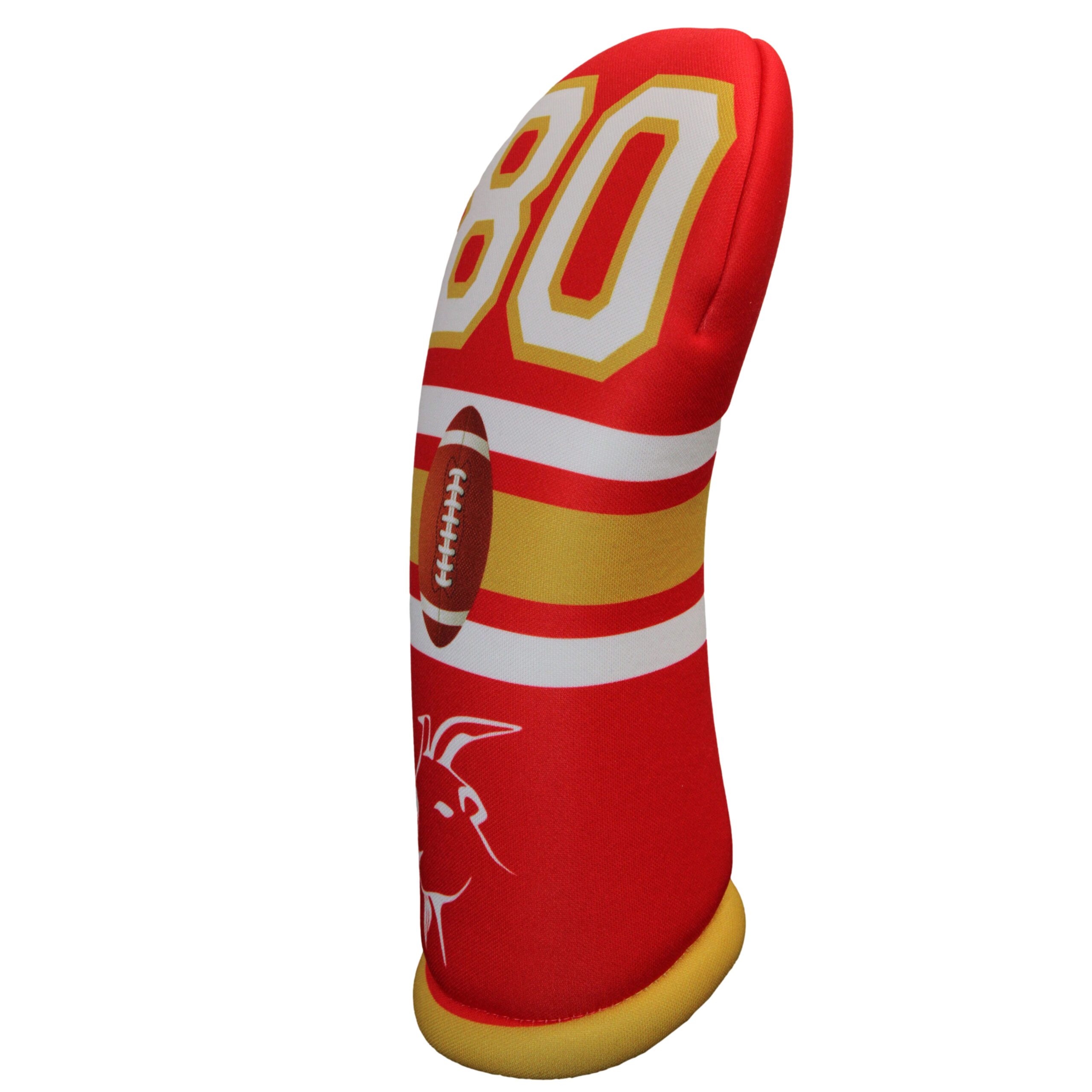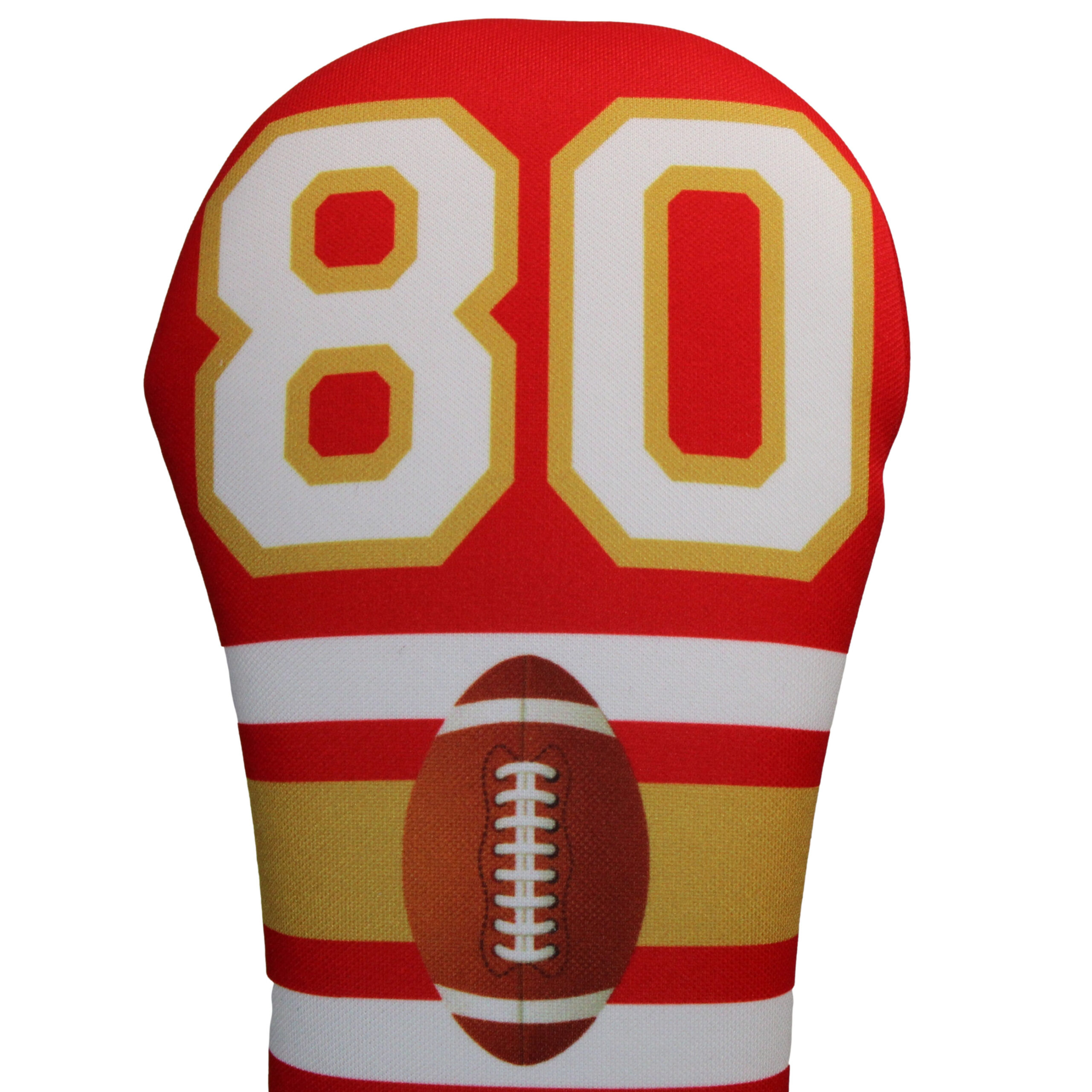 Introducing the ultimate golf club headcover for fans of the greatest football player of all time – the GOAT Football 80 headcover in red and gold!