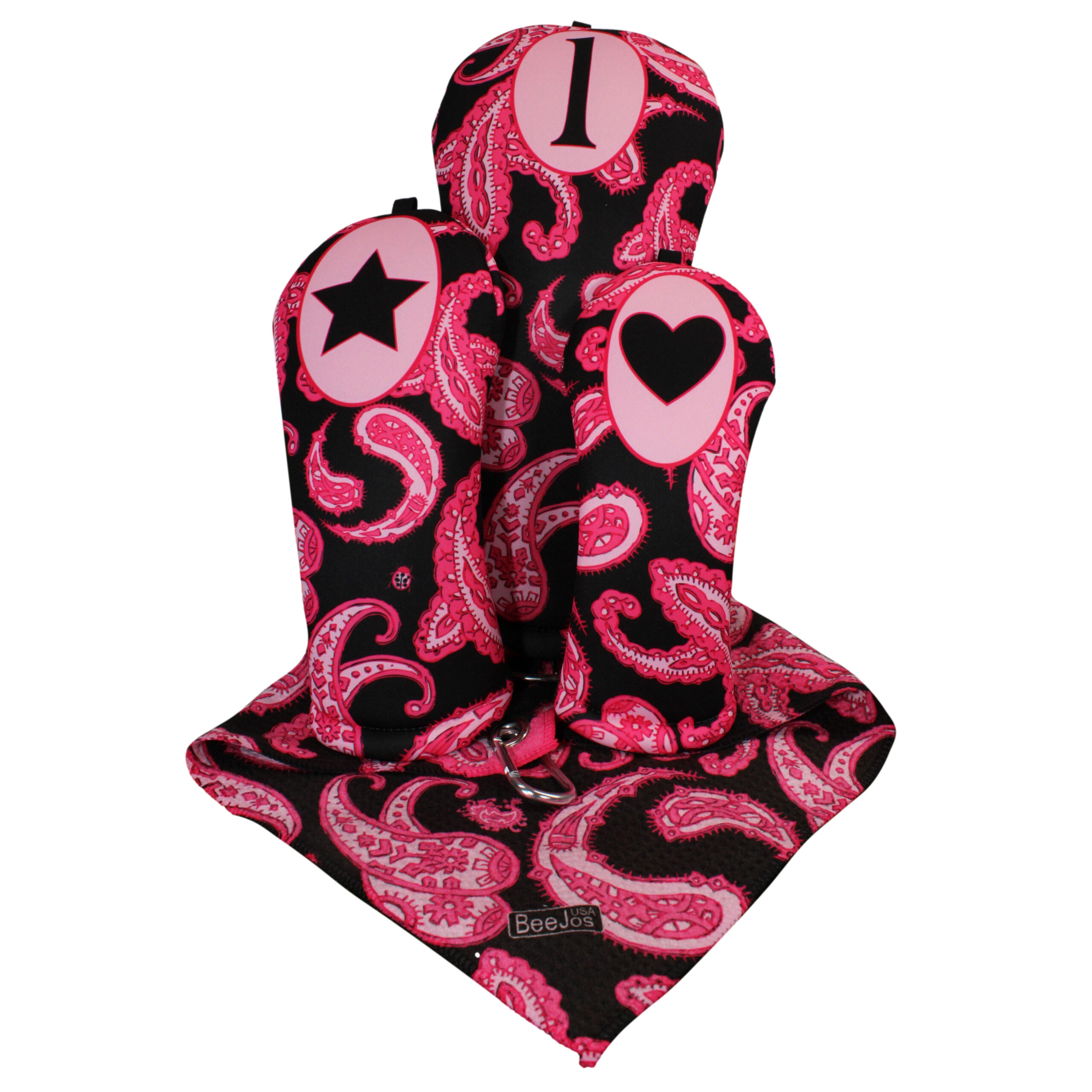 4 Piece Golf Gift Set-Women’s Collection Classic Pink Paisley | BeeJo’s Golf 3 Headcovers & Microfiber Towel